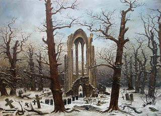 Ahora veo la nieve de otro modo, más trascendente y menos optimista. Empiezo a entender a los artistas románticos. Para el Romanticismo la nieve era una metáfora de la muerte. La retirada de Napoleón de las heladas tierras de la Madre Rusia plasmada magistralmente en el lienzo de Northen (1), el final del clasicismo, el crepúsculo de los dioses. Pintores como C.D. Friedrich (2), William Turner o el mismo Northen reflejaron en sus lienzos la angustia existencial de un hombre moderno abocado al absurdo y la contingencia. Esos paisajes nevados, las ruinas , los cementerios, la “atracción del abismo”(3).